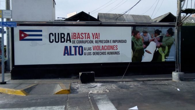 La valla busca visibilizar la violaciones a los derechos humanos en la Isla entre la población peruana y asistentes a la cita: representantes de los estados, miembros de la sociedad civil de los diferentes países, diplomáticos, entre otros.
