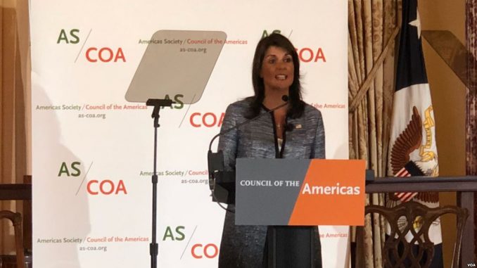 En un discurso del Consejo de las Américas que se realiza en Washington, DC., este ocho de mayo, Nikki Haley dijo que «La opresión sistemática del pueblo venezolano se ha convertido en una amenaza activa para toda la región. Para la seguridad de todos los pueblos de América Latina, es hora de que Maduro se vaya».